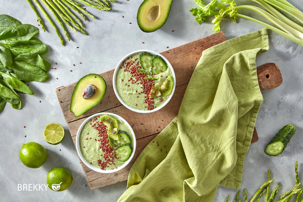 Spinat ist kalorienarm und reich an Vitaminen. Das hinzugefügte Matcha-Pulver bringt eine sanfte Wachmacher-Wirkung und enthält wertvolle Antioxidantien.
